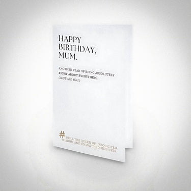 This birthday card serves sass, reverence, and a sprinkle of I told you so, all in one gloriously minimalist design. Because if there’s one thing Mum’s mastered, it’s unsolicited wisdom wrapped in a passive-aggressive glance.