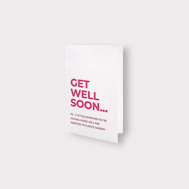Lighten the mood with this hilariously cheeky Get Well Soon card. The front features the playful quote: "Get well soon... P.S. - I've told everyone you're having a boob job & are addicted to plastic surgery." Perfect for a friend who can appreciate a good laugh, even when they're not feeling their best.